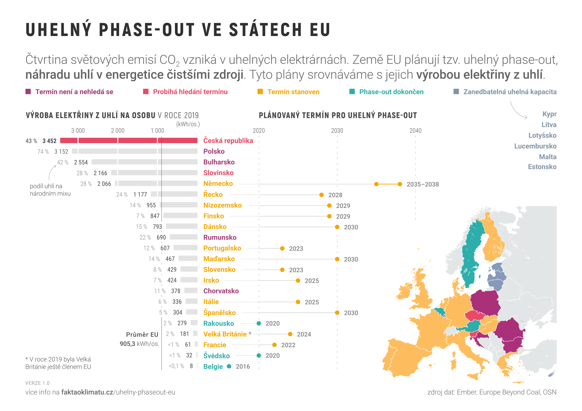 Jak se státy plánují zbavit výroby uhlí. Autorem infografiky jsou Fakta o klimatu, licencováno pod CC BY 4.0.
