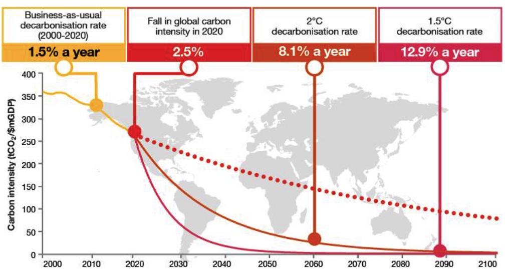 Ke splnění cíle, aby globální oteplování nepřekročilo klíčových 1,5 °C, musí svět dekarbonizovat pětkrát rychleji než dosud mezi lety 2019 a 2020. Oproti průměru 21. století pak musí tempo snižování uhlíkové náročnosti, neboli dekarbonizace, zrychlit osminásobně.