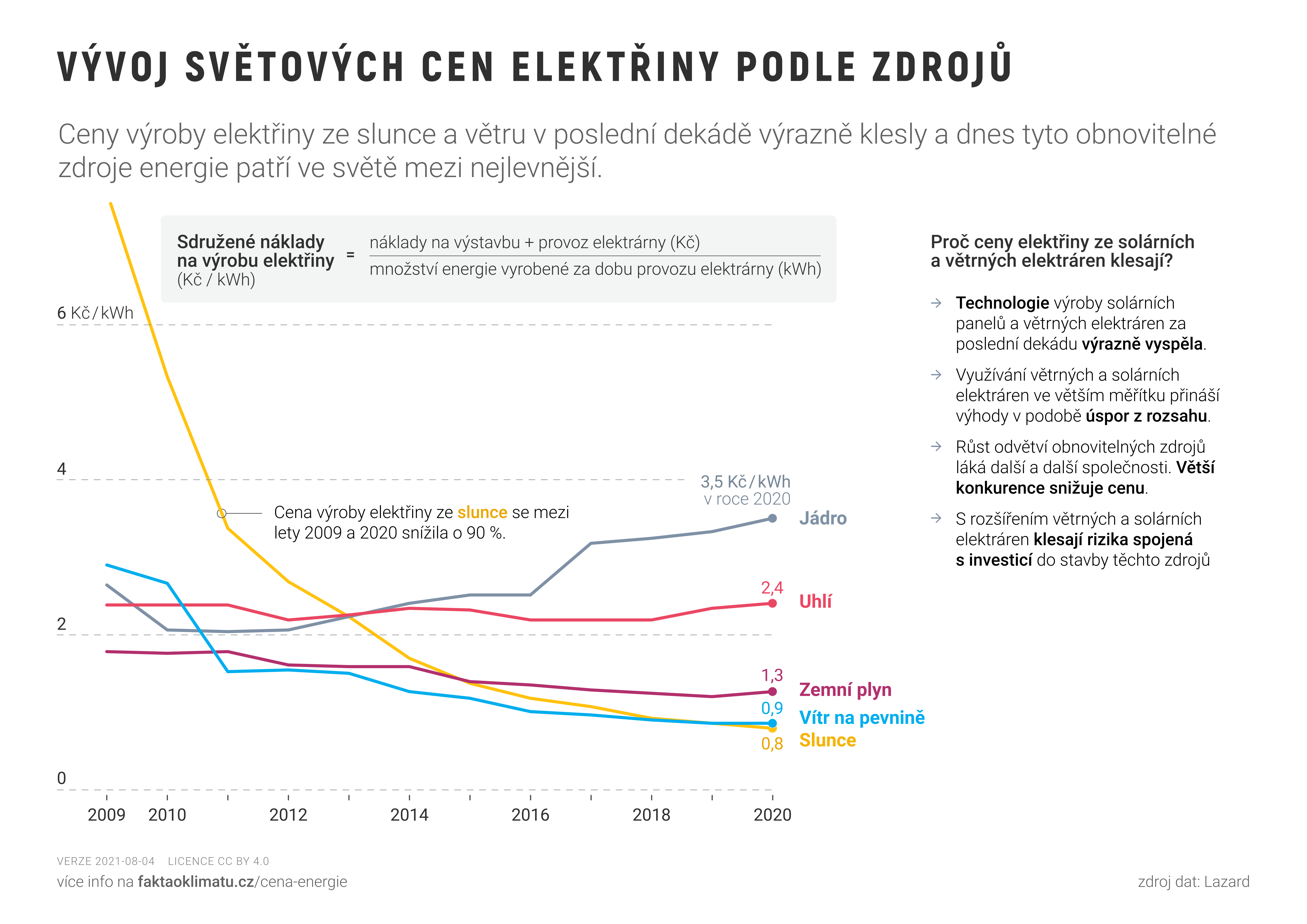 - Vývoj světových cen elektřiny podle zdrojů od autora Fakta o klimatu, licencováno pod CC BY 4.0.
