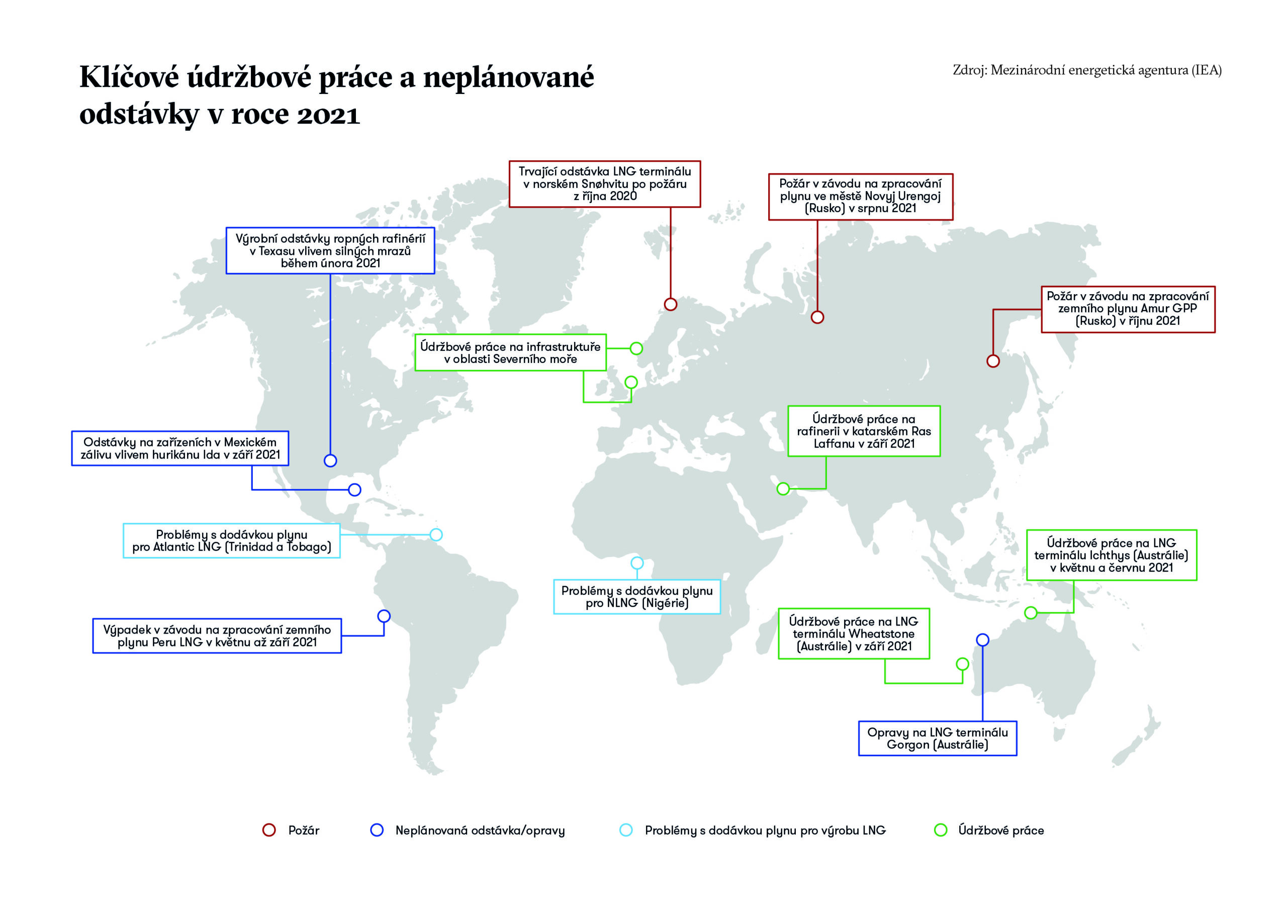 - neplánované výpadky fosilní infrastruktury vlivem provozních nehod nebo výskytu extrémních klimatických jevů (viz mapa).