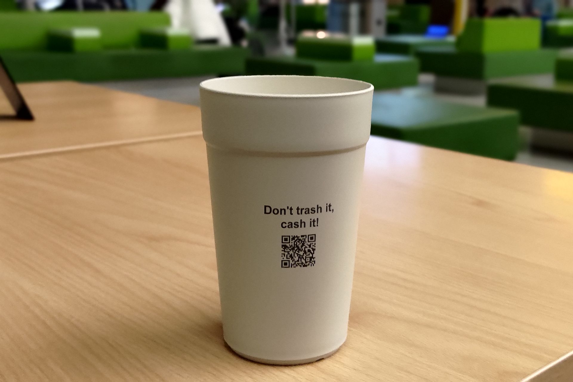 Jednorázové kelímky tvoří osm procent odpadu terminálu. V prostoru letiště je rozmístěno několik automatů na vracení kelímků. Cestující do nich kelímek po vypití nápoje vloží, automat naskenuje kód a oznámí, kolik vrátí peněz. Je ale potřeba načíst platební kartu, na kterou peníze pošle.