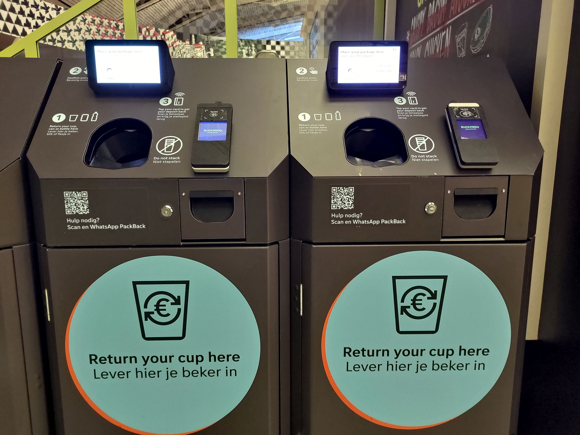 Amsterdamské letiště Schiphol, jímž loni prošlo 69 milionů cestujících, testuje v kavárnách vratné kelímky na kávu. V restaurační zóně Lounge 4 dostane zákazník kávu či jiný teplý nápoj do obalu, který je k dispozici ve třech velikostech. Záloha činí jedno euro a kupující zálohu zaplatí spolu s kávou. Obsluha zároveň naskenuje kód na kelímku.