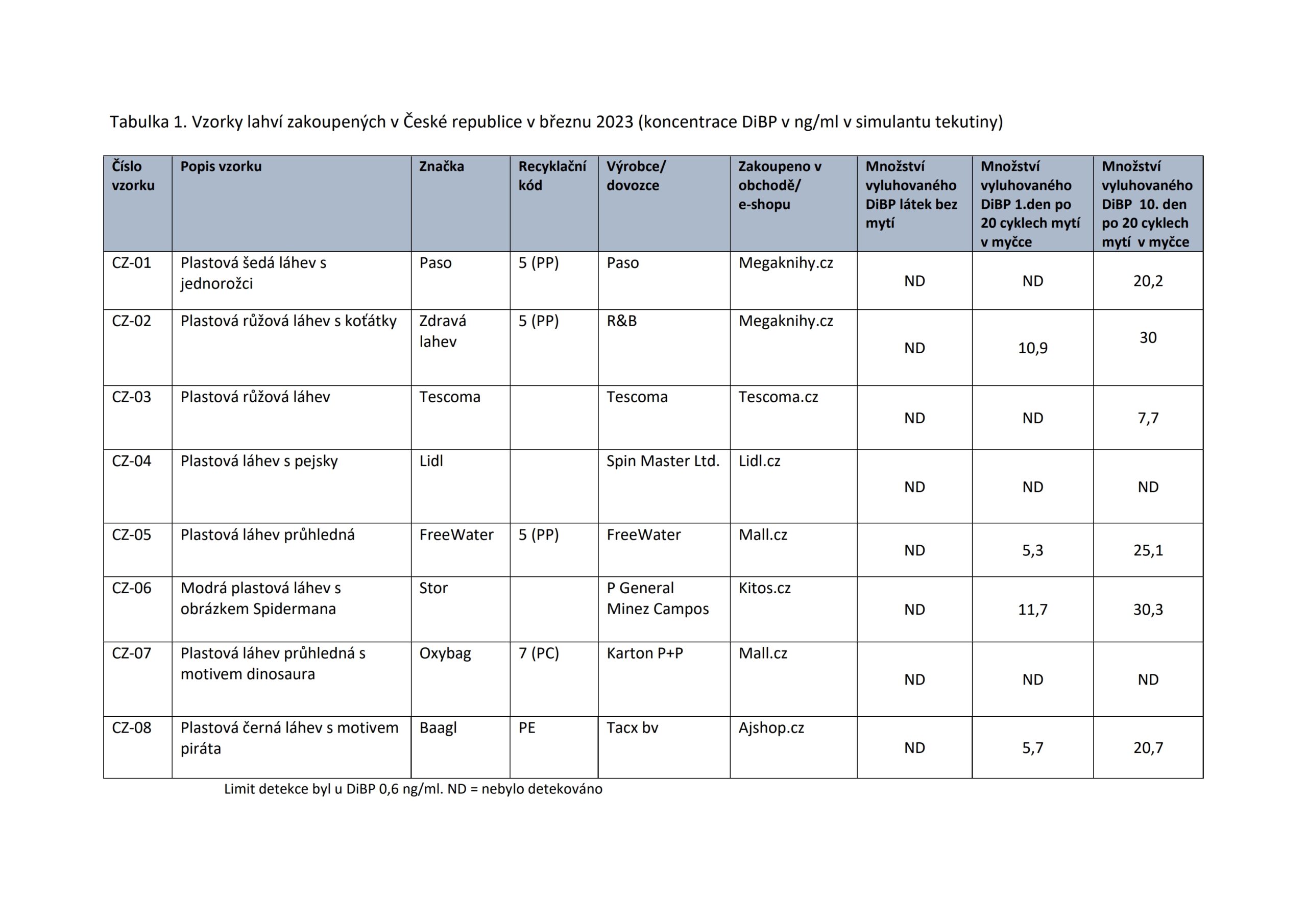 Po umytí v myčce nádobí byl DiBP nalezen ve 22 z 39 lahví a pouze v jedné láhvi, která neprošla myčkou. Experti proto dospěli k závěru, že mytí v myčce mělo vliv na migraci DiBP do simulantu nápoje. Koncentrace DiBP naměřené v obsahu tekutiny byly navíc vyšší po deseti dnech, kdy tekutina v lahvích stála, ve srovnání s 24 hodinami.