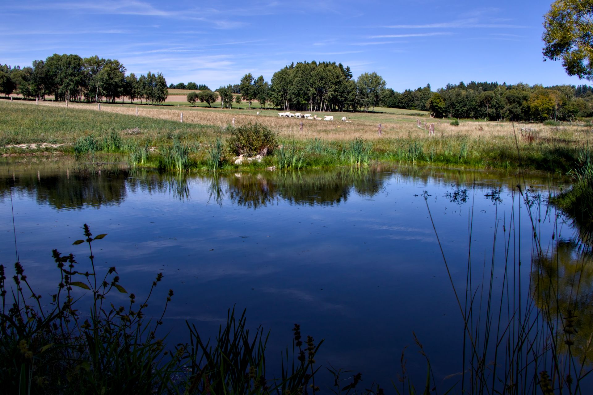 Když později stoupáme na kopec nad Černovicemi, mezi poli vidíme malé tůně. Odděluje nás od nich úzkokolejka, po níž ještě před pár lety jezdila lokálka spojující Jindřichův Hradec a Obrataň. Sérii vodních prvků propojuje přeskakující proud vody a poblíž polehávají krávy.