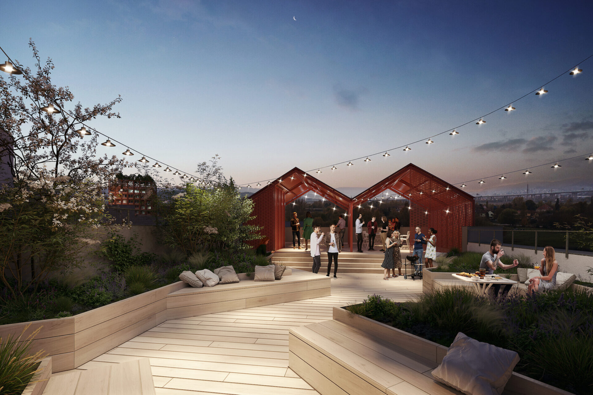 - Modřanský cukrovar, komunitní terasa až pro 100 lidí na jednom z domů. Vizualizace: poskytnuta společností Skanska
