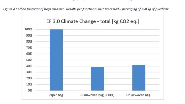 Pokud jde o uhlíkovou stopu, je dopad plastové tašky na vícero použití na úrovni 42 procent (resp. 38 procent při započítání většího objemu) té papírové.