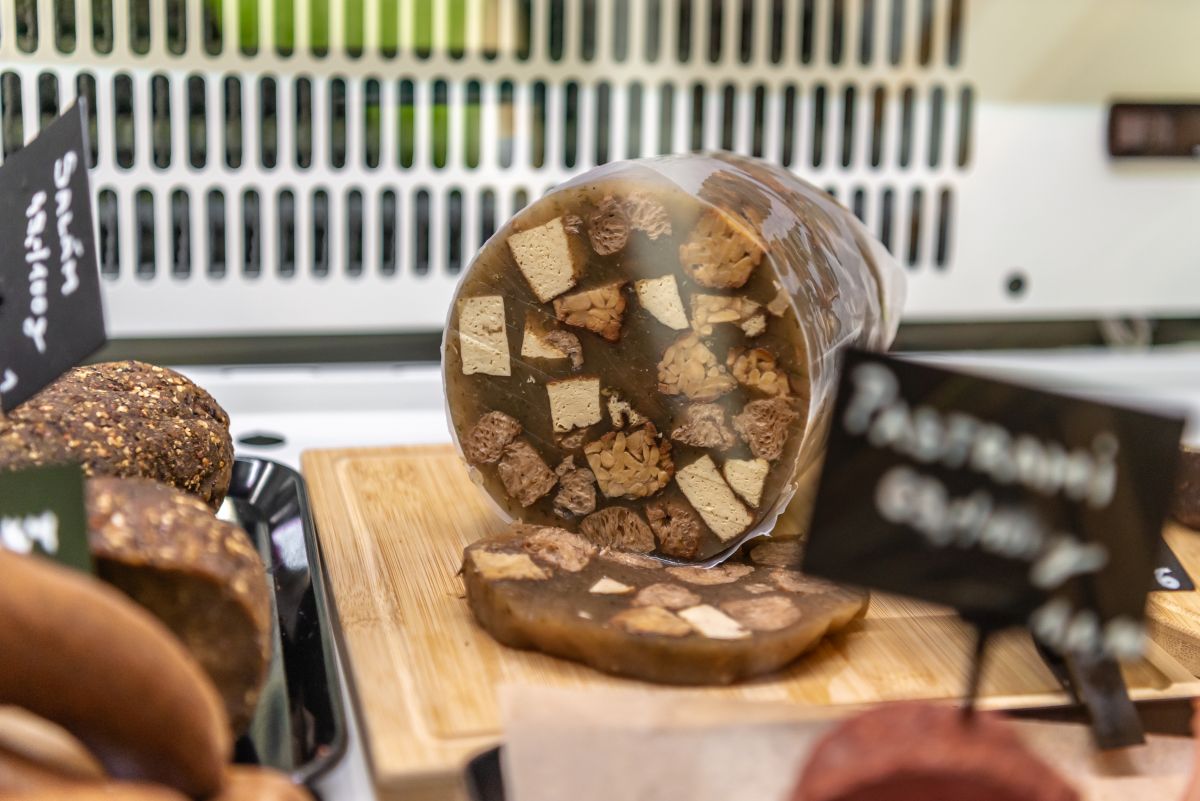 Nabídka se v poslední době rozšířila o rostlinnou verzi svíčkové, kterou je možné ochutnat v úpravě Wellington přímo v prodejně. Základem je seitan, tofu a cizrnová mouka. Důležitý je navíc proces výroby. „Záleží na tom, jak dlouho se směs mixuje a jak se vaří, aby měla správnou strukturu a chuť,“ popisuje Kahleová. Veganská svíčková se například přes noc vaří v zeleninovém vývaru, aby se všechny chutě propojily.
